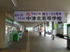 平成23年5月12日(木)、創立100周年の懸垂幕が体育館壁面に設置されました。後日、中津駅南口コンコースには看板を設置しました。